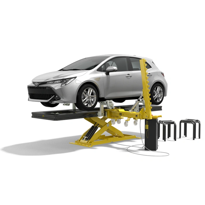 Because this bench has a height of only 14.5 cm in its lowest position when not placed in-ground, it is easy to position a car on it. The optional R10 Drive-On Ramp allows cars with little ground clearance, such as exotic sportscars, to be placed on the bench. This frame machine is compatible with all UnoLiner accessories. The CRS4000-RO set includes an F40 Bench Frame with an L30 Scissor Lift, 4x C10 Quick-Lock Universal Chassis Clamps, 4x B10 Bench Adapters, 4x H10 Wheel Stand, 1x P10 Draw Aligner Pulling Tower, and 1x F1030 Bench Height Set.